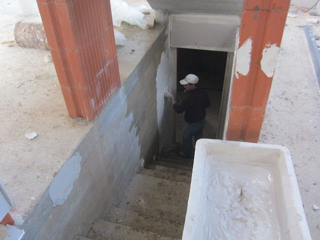 La cage d'escalier du sous-sol est enduite de plâtre fin pour assurer son étanchéité à l'air (BBC) avant d'être habillée de placo.
